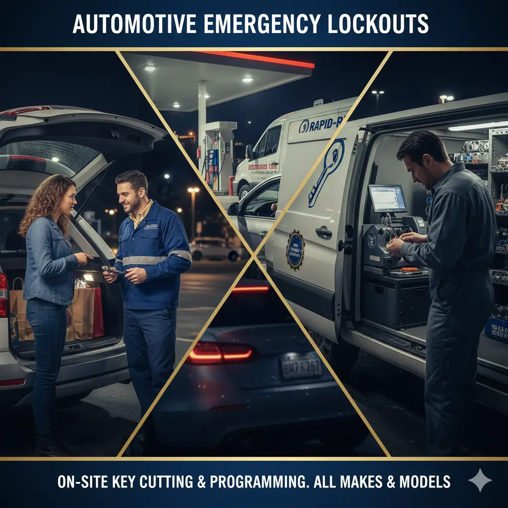 Locked your keys in the trunk or ignition? Our automotive emergency experts provide on-site vehicle entry for all makes and models. If your keys are lost or broken, we don’t just open the car—we can cut and program new transponder keys and smart fobs on the spot, saving you a costly tow to the dealership.
